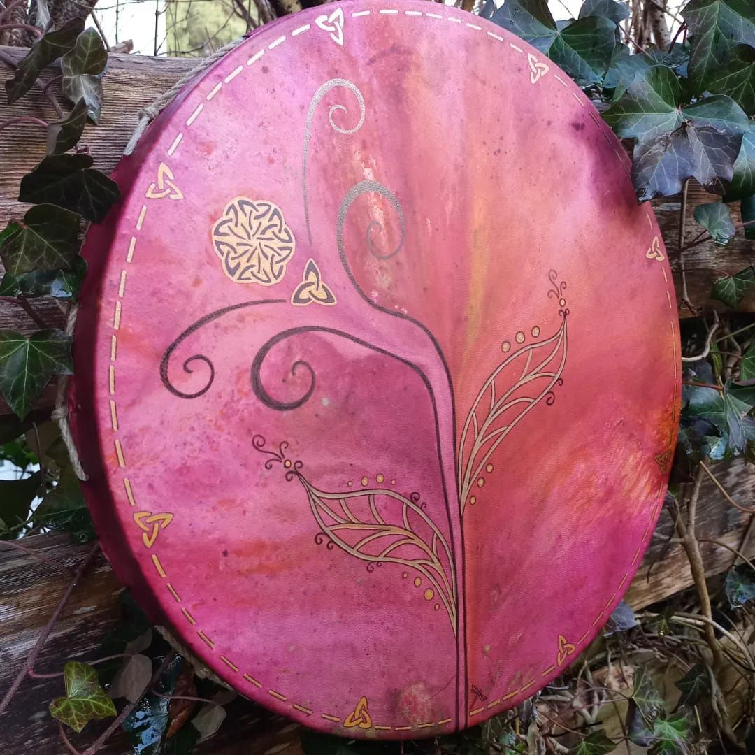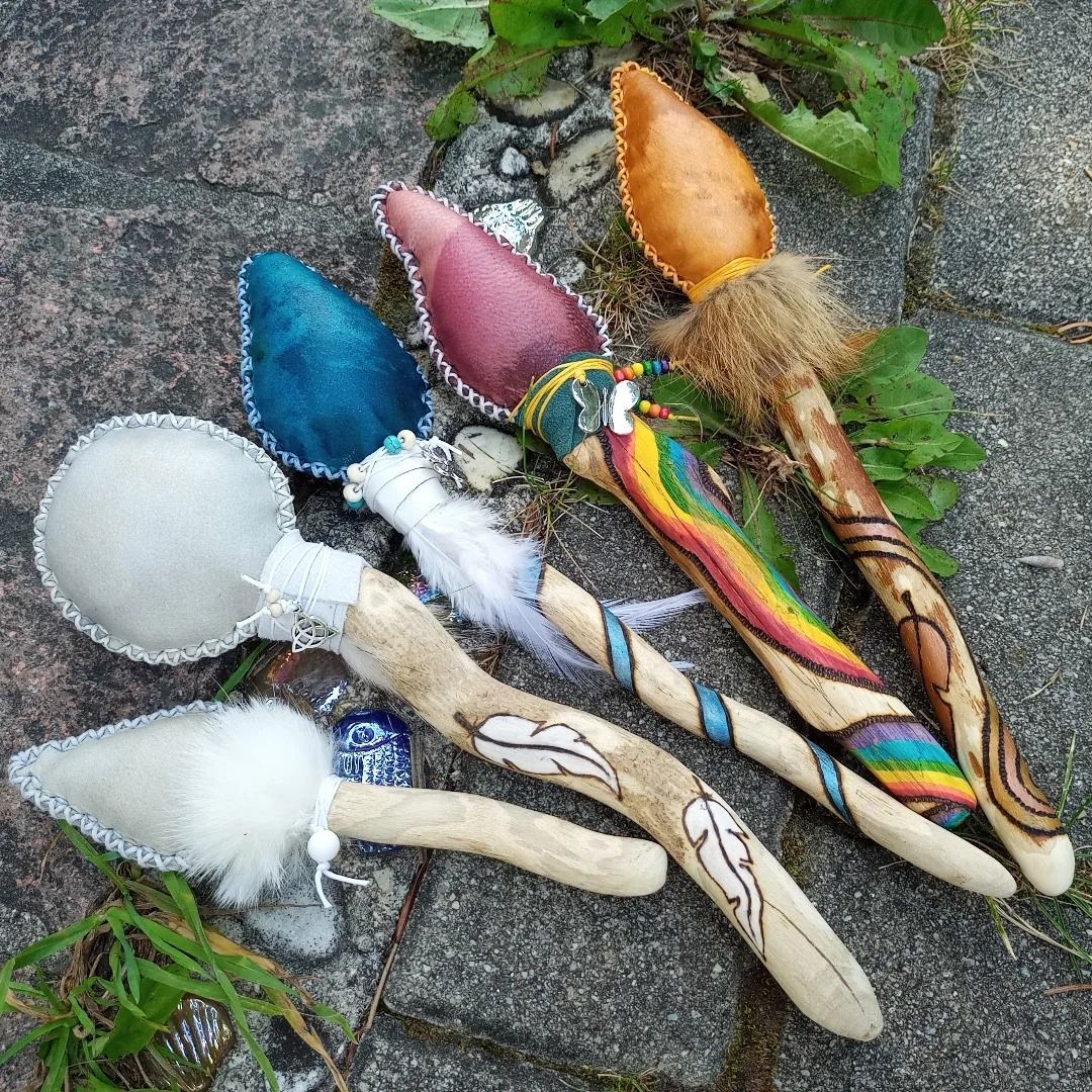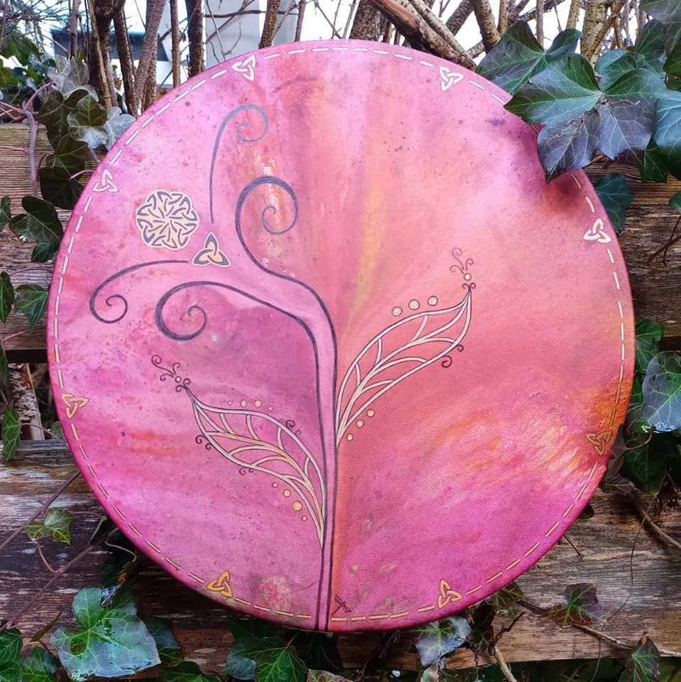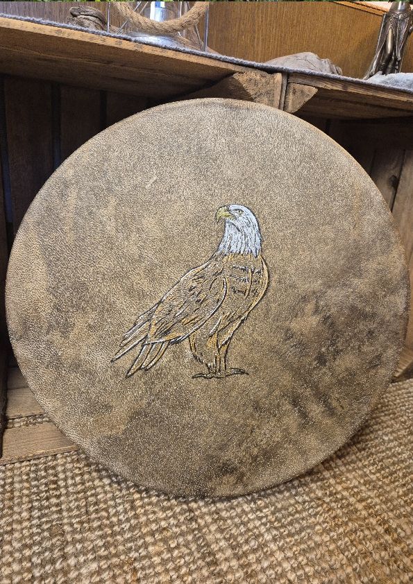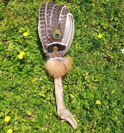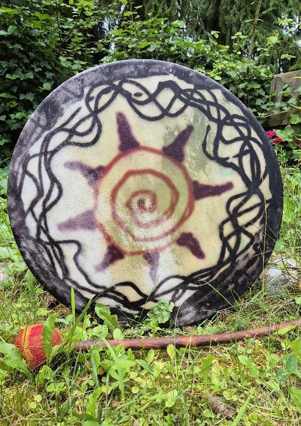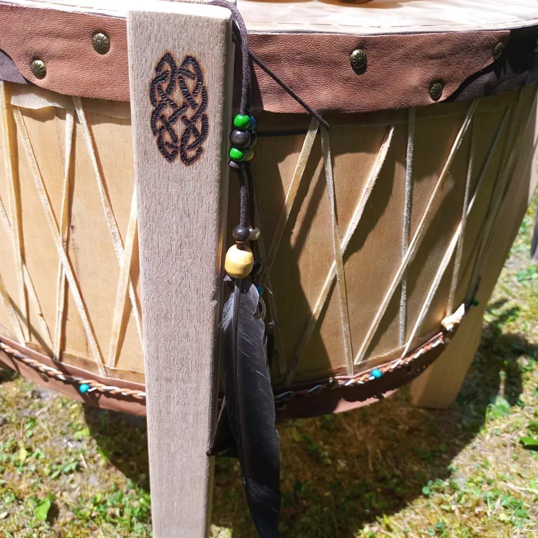 Die Trommel trägt vier Federn von folgenden Vögeln: Rabe, Pfau, Bussard und Eule und wurde aufwändig verziert mit Leder und Brandmalerei.