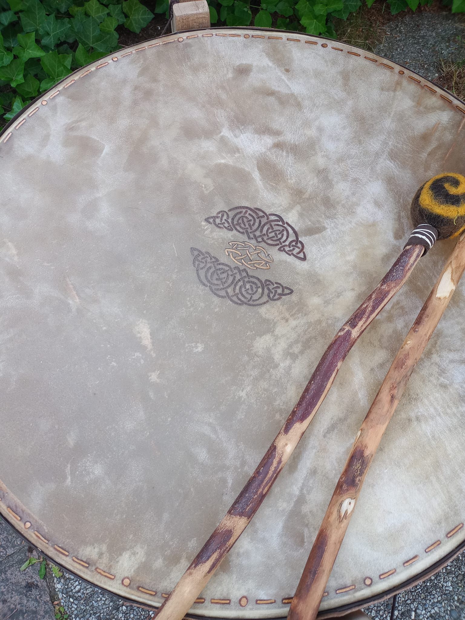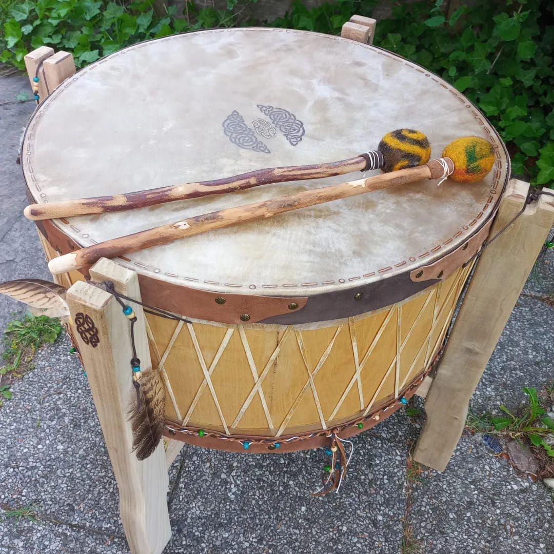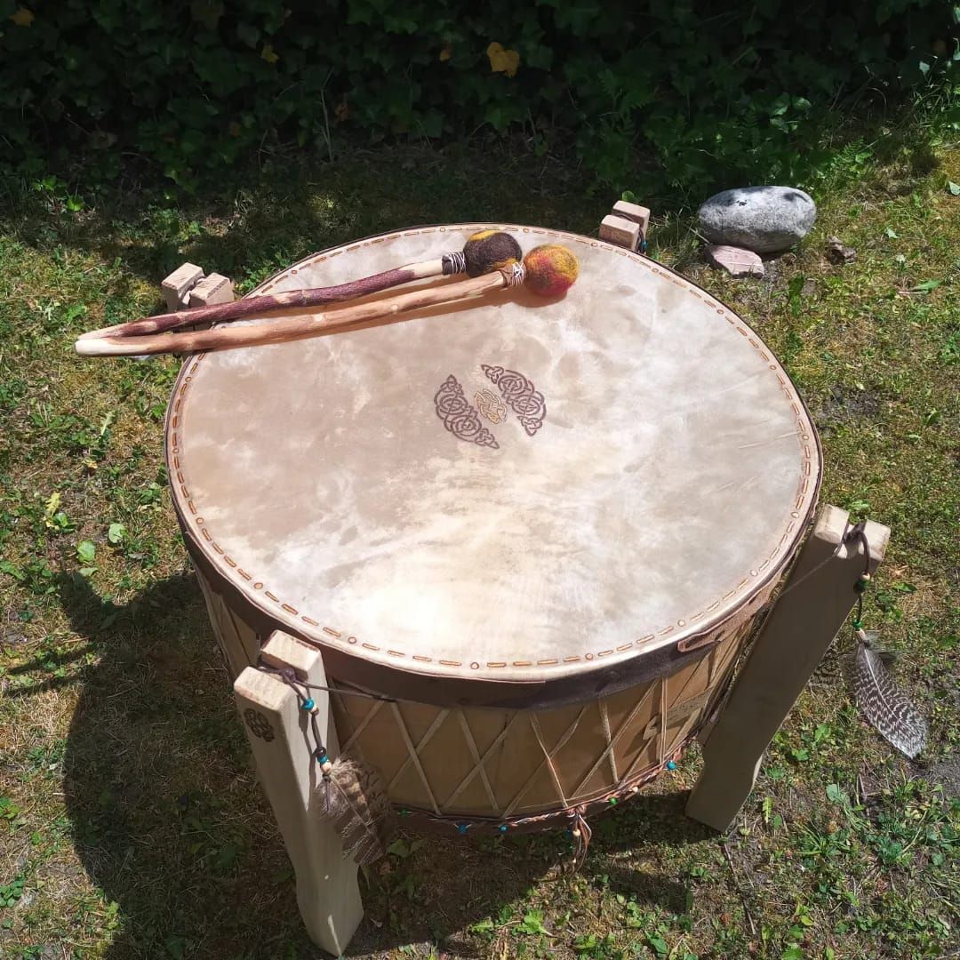 Standtrommel! - diese zauberhafte Seele mit tollem dunklen Ton sucht ihren Wirkungskreis. Ideal für Gruppenarbeit, Spaß an der Tiefe, für Körperarbeit, Singen, PowWow Freude oder Freiland Trommeln - ihr Schwingungsradius ist toll :)